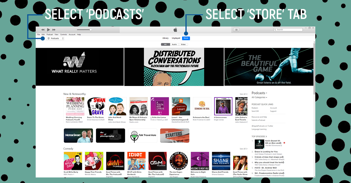 NOTE: You should make sure the Store tab is selected, and that you are searching for “Podcasts”